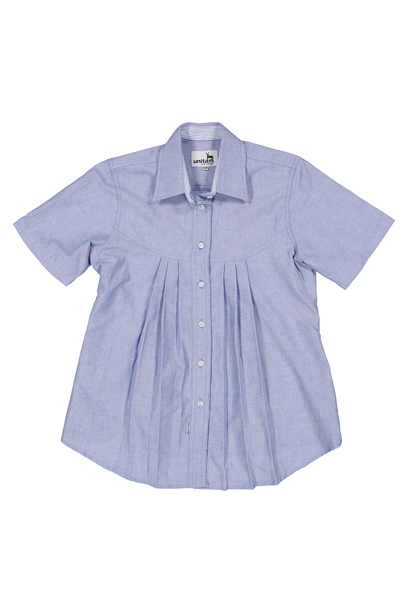 Cuello para corbata, corte al frente con 3 pinzas sueltas de cada lado y cinta suelta en la espalda para ajuste en la cintura