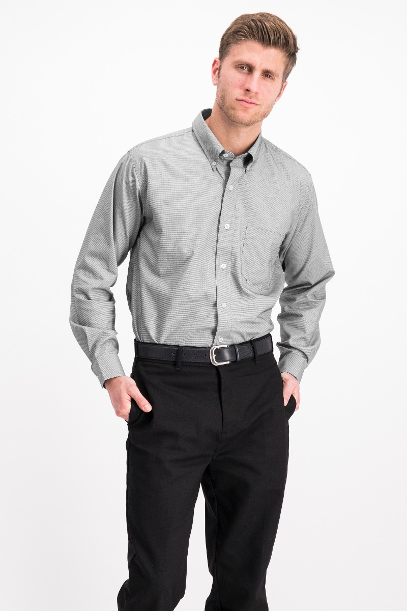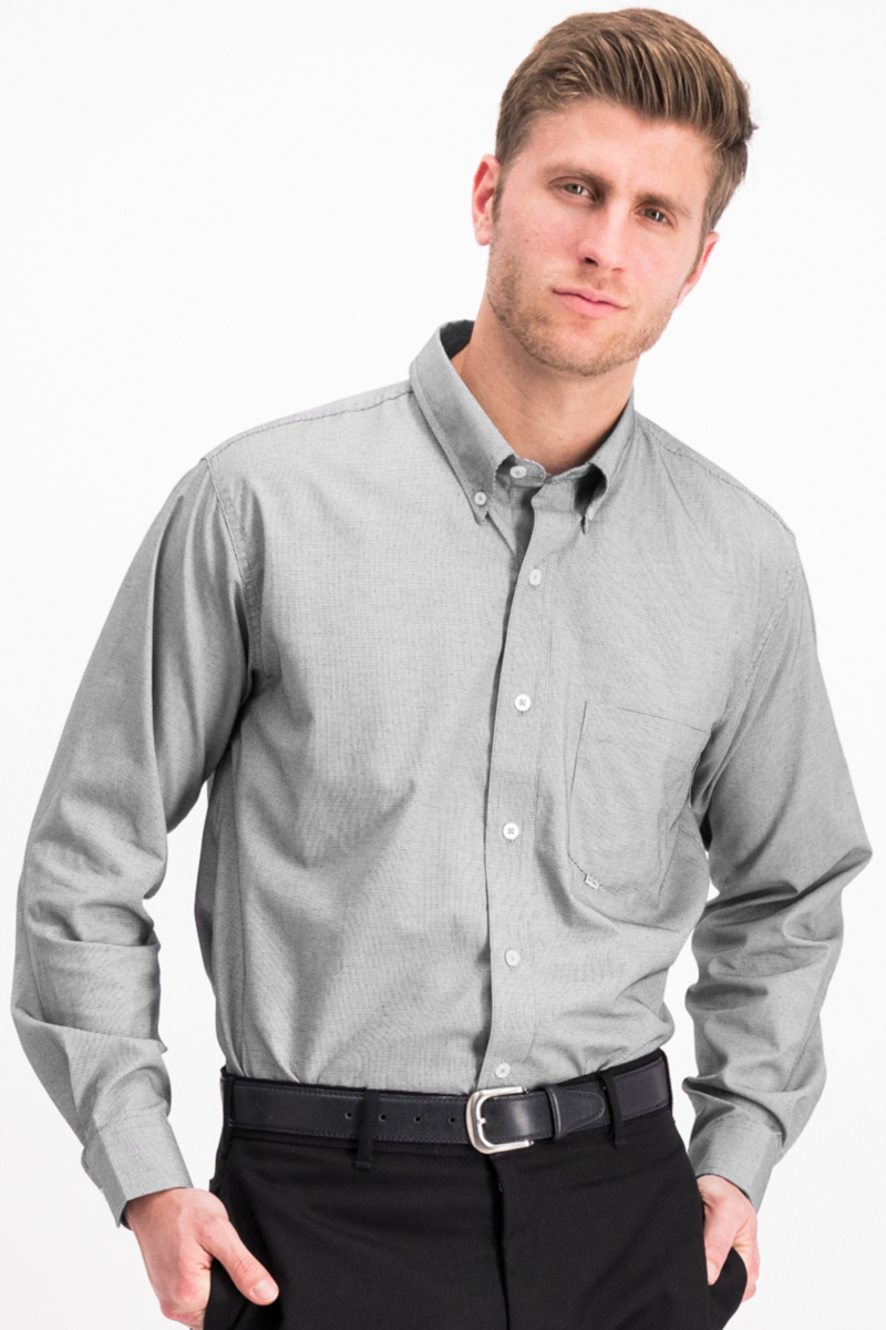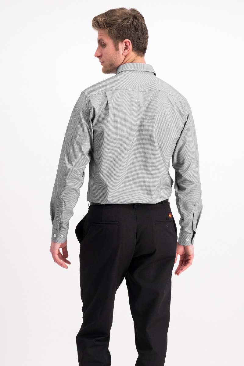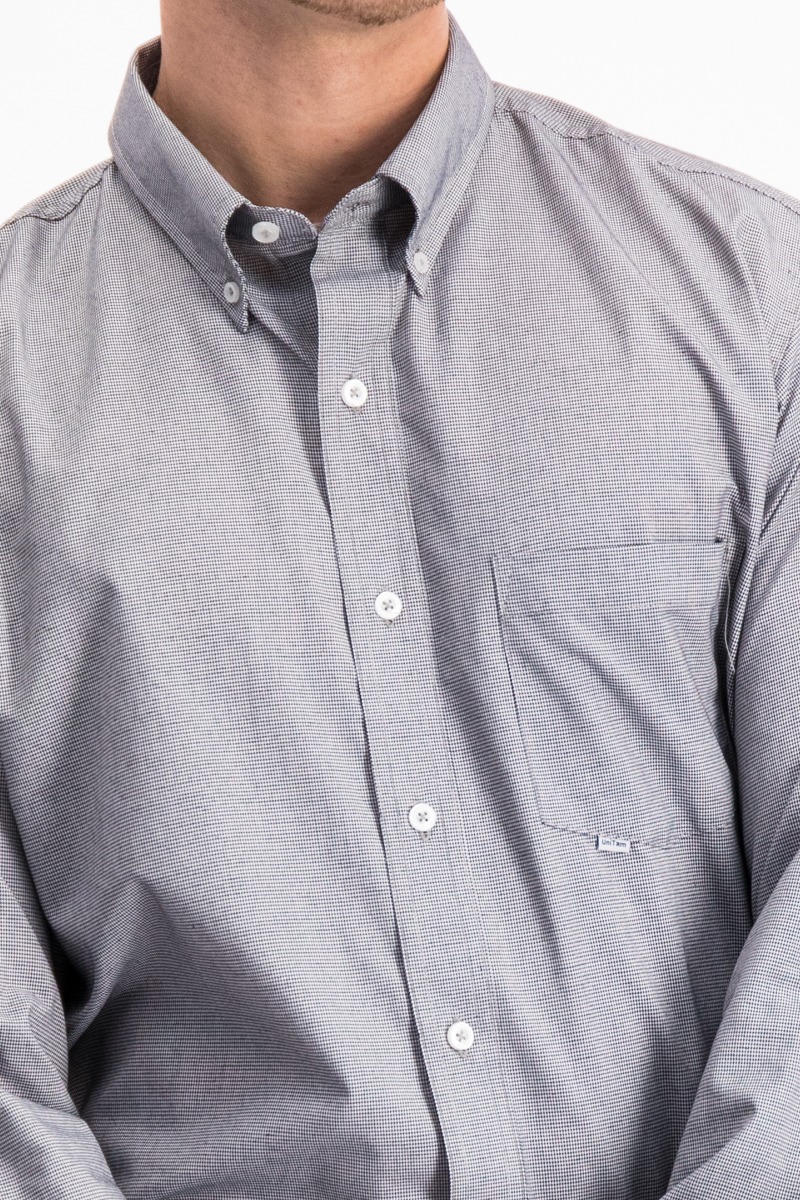 Con cuello para corbata, botón en las puntas (button down), una bolsa de parche en pico y pliegue en cada lado de la espalda.